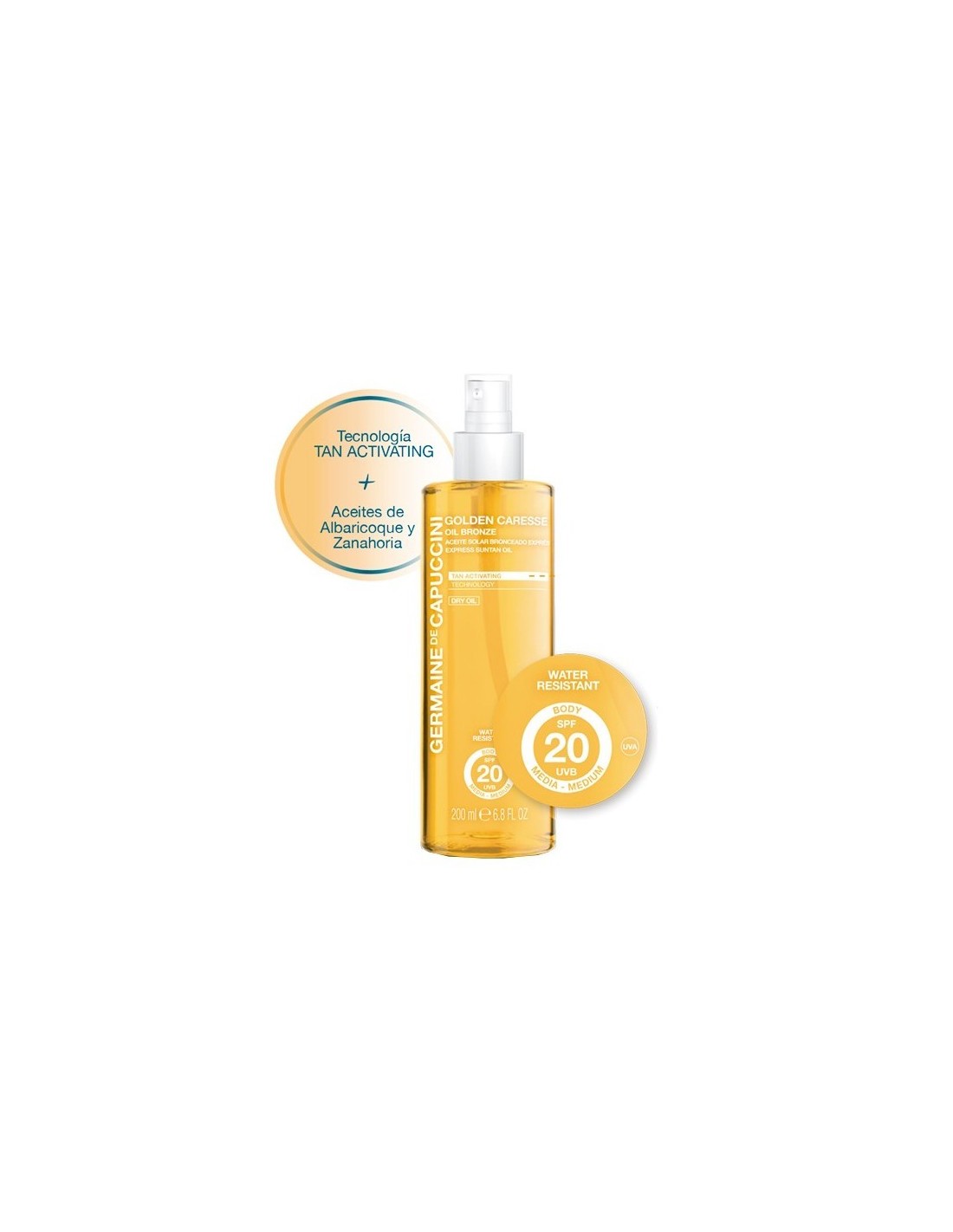 Aceite nutritivo, protector y acelerador del bronceado, extra ligero, que seca inmediatamente sin dejar sensación grasa ni pegajosa y proporciona rápidamente un tono dorado más intenso y luminoso que se prolonga en el tiempo.